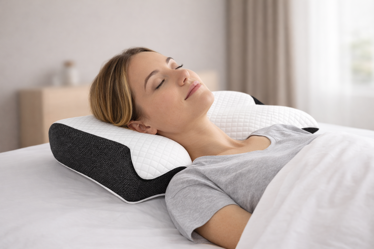 Zdrowa pozycja snu – idealnie podpiera szyję i kręgosłup, zapobiegając bólom