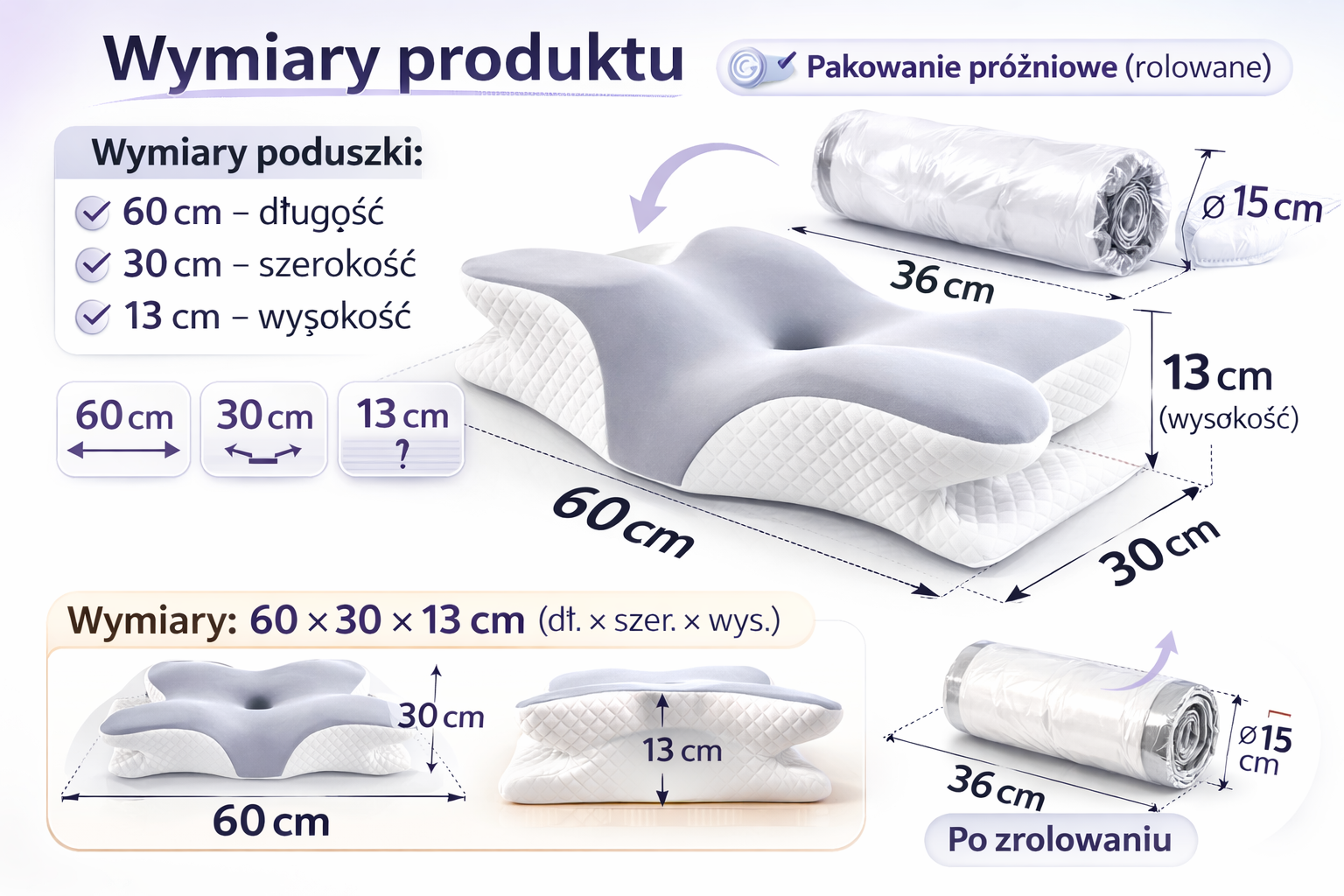 ✓ Zdrowa pozycja snu – idealnie podpiera szyję i kręgosłup, zapobiegając bólom